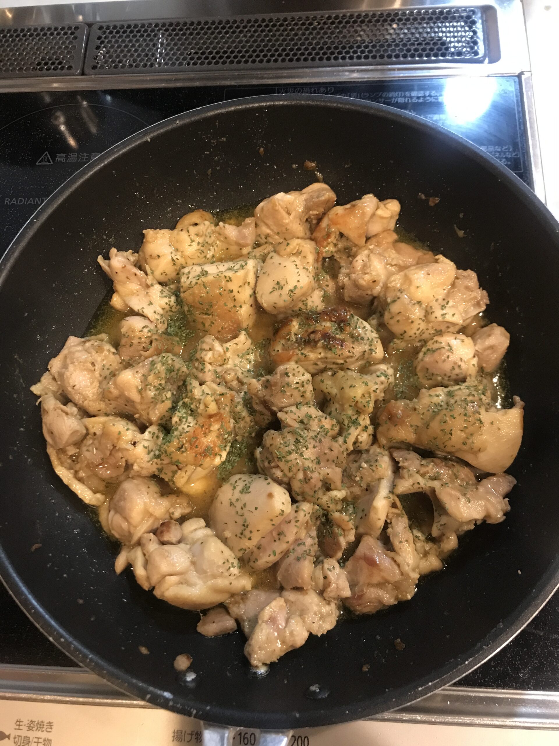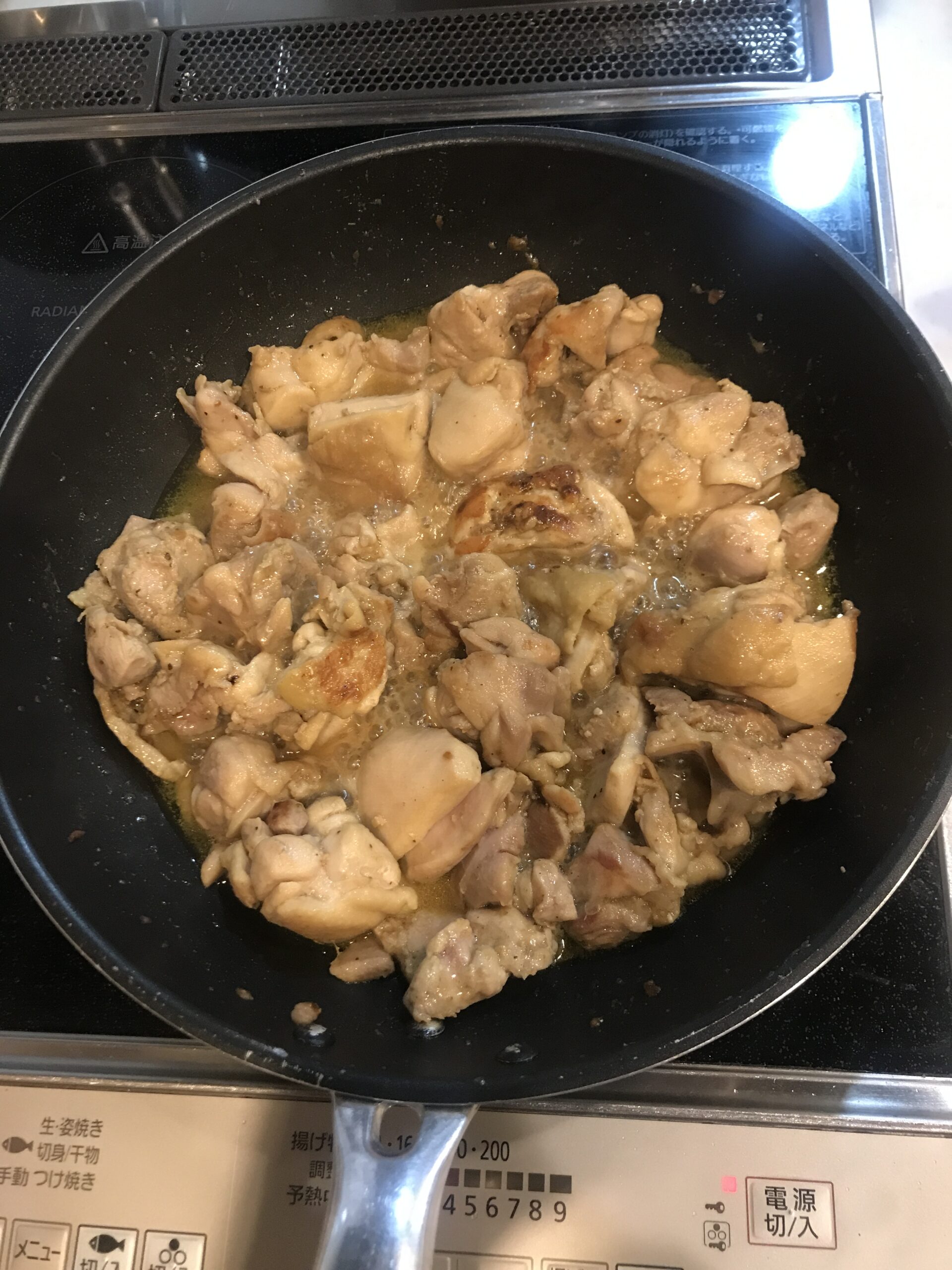 - ①お好みの大きさでカットした鶏肉を塩、コショウで炒めて調味料Aをすべて入れる