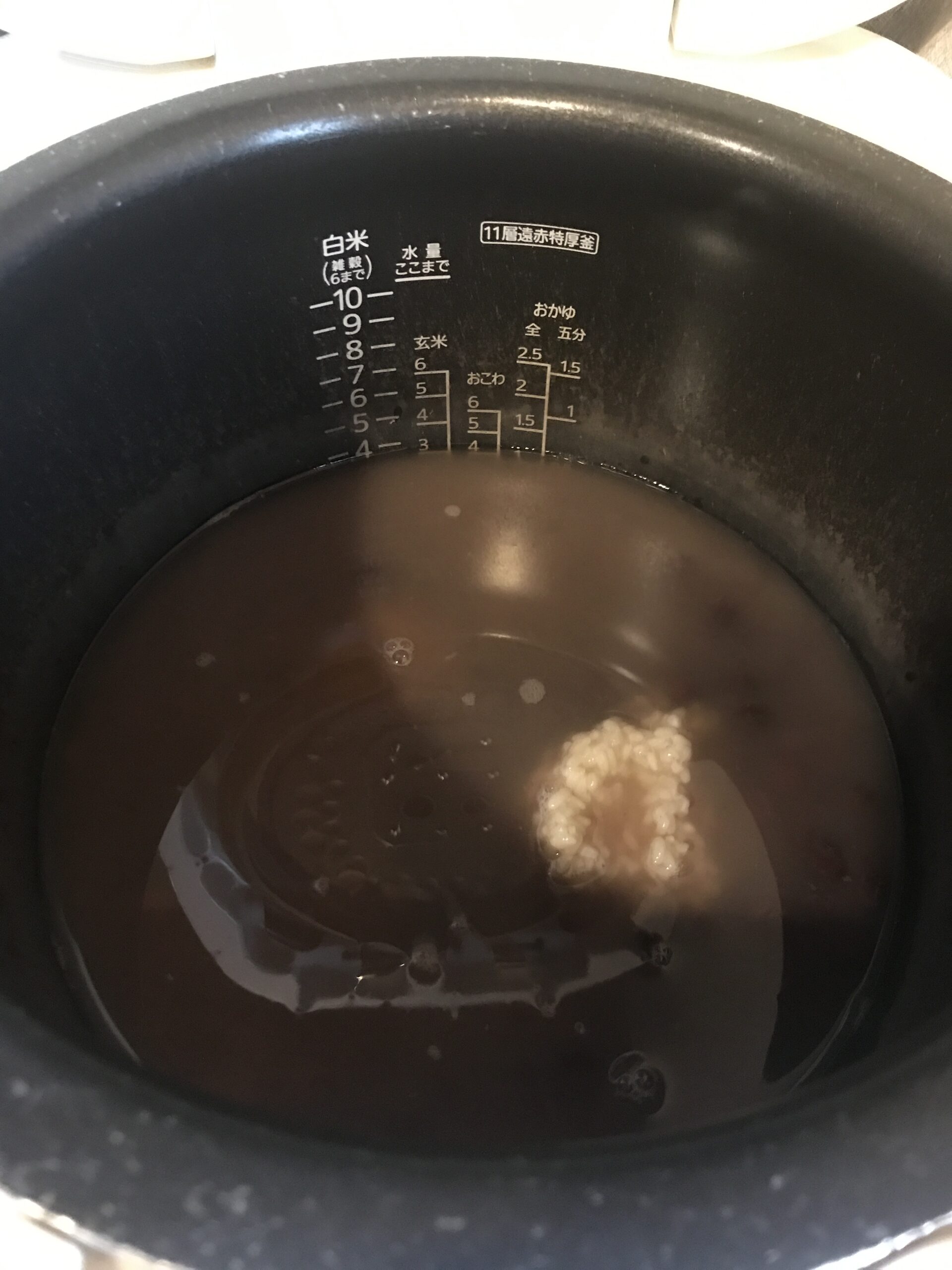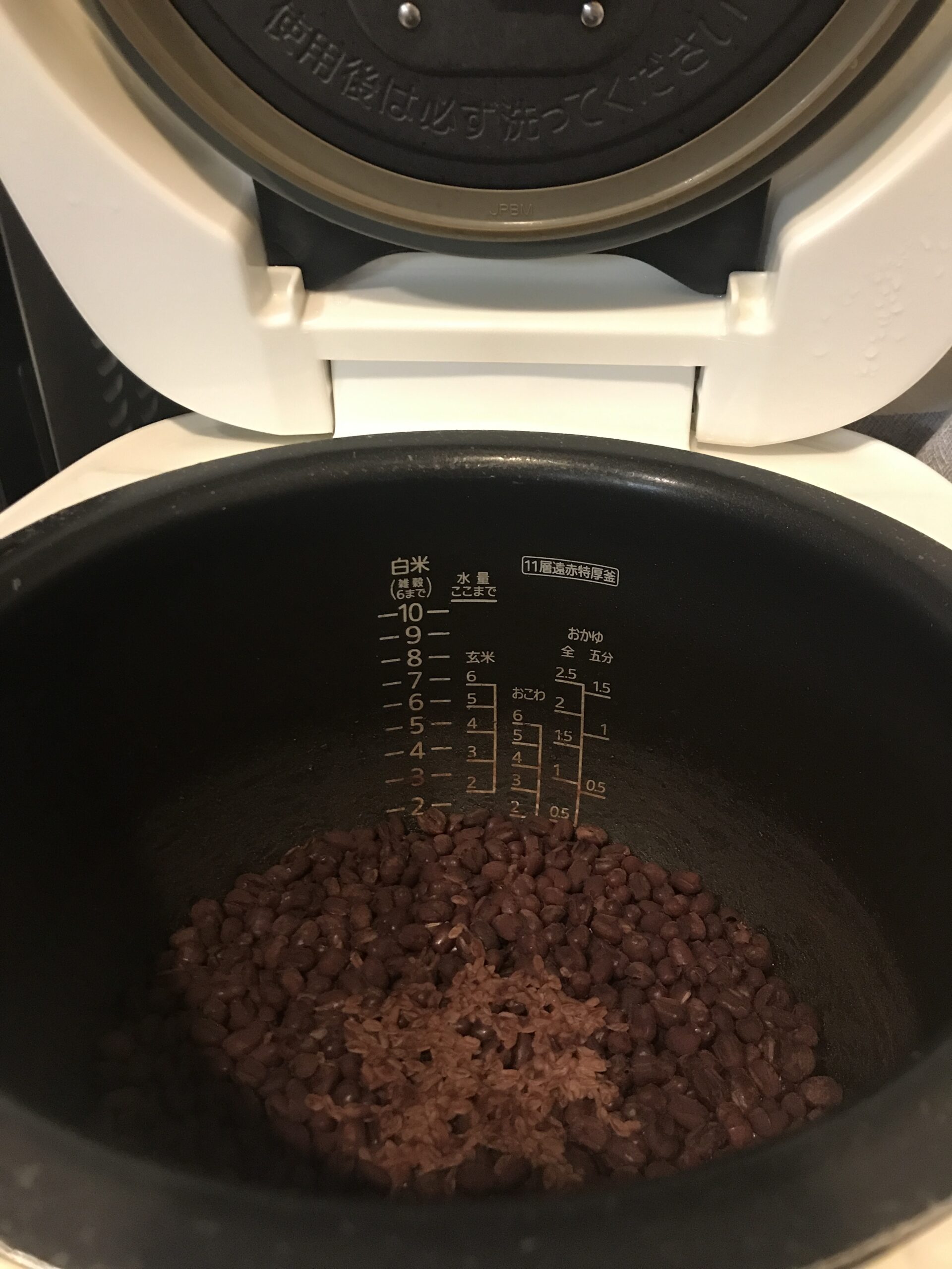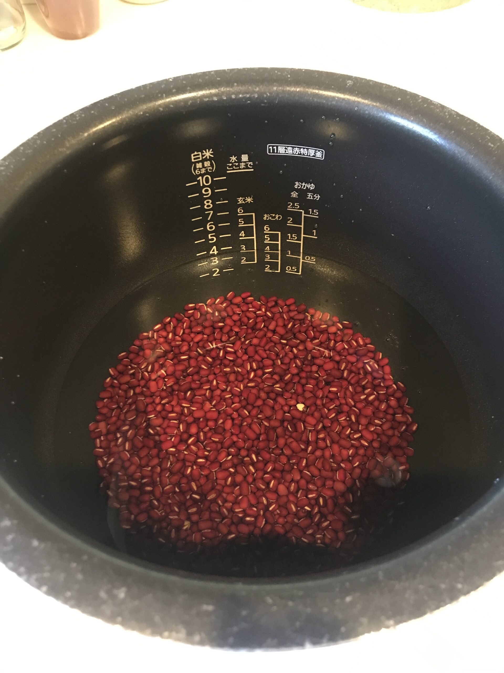 - 小豆を軽く水で洗って、炊飯器に小豆と水を入れる。水は少し多めの方がいいので3~4号炊きメモリの間で【炊飯器のメーカーによっては違いがあるかもしれません】